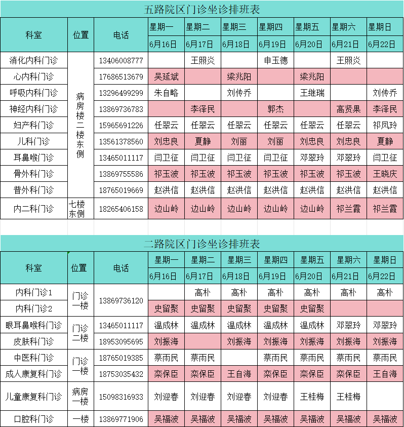 尊敬的广大居民朋友:为满足广大群众就医需求,全心全意为人民健康保驾护航!现将2025年6月16日---6月22日门诊医生坐诊表予以公布,请根据需要...